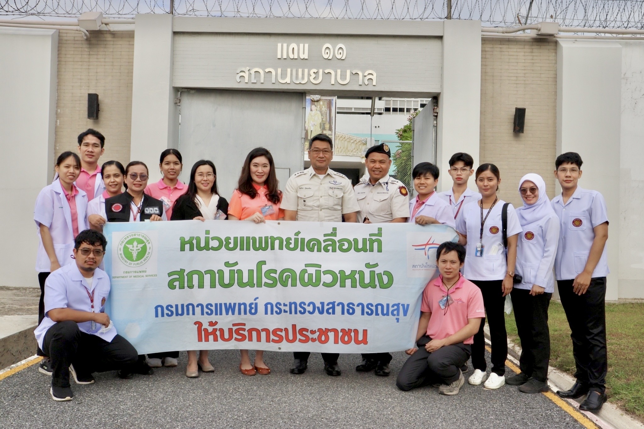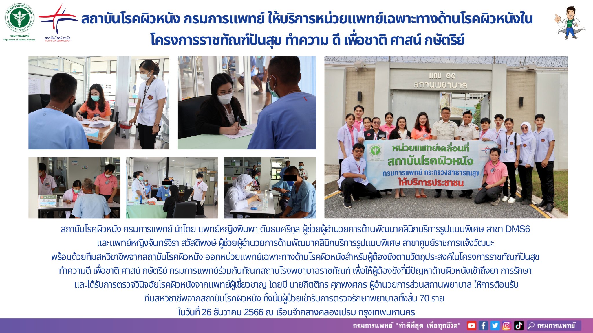สถาบันโรคผิวหนัง กรมการเเพทย์ นำโดย แพทย์หญิงพิมพา ตันธนศรีกุล ผู้ช่วยผู้อำนวยการด้านพัฒนาคลินิกบริการรูปแบบพิเศษ สาขา DMS6 และแพทย์หญิงจันทร์จิรา สวัสดิพงษ์ ผู้ช่วยผู้อำนวยการด้านพัฒนาคลินิกบริการรูปแบบพิเศษ สาขาศูนย์ราชการแจ้งวัฒนะ พร้อมด้วยทีมสหวิชาชีพจากสถาบันโรคผิวหนัง ออกหน่วยแพทย์เฉพาะทางด้านโรคผิวหนังสำหรับผู้ต้องขังตามวัตถุประสงค์ในโครงการราชทัณฑ์ปันสุข ทำความดี เพื่อชาติ ศาสน์ กษัตริย์ กรมการแพทย์ร่วมกับทัณฑสถานโรงพยาบาลราชทัณฑ์ เพื่อให้ผู้ต้องขังที่มีปัญหาด้านผิวหนังเข้าถึงยา การรักษา และได้รับการตรวจวินิจฉัยโรคผิวหนังจากแพทย์ผู้เชี่ยวชาญ โดยมี นายกิตติกร ศุภพงศกร ผู้อำนวยการส่วนสถานพยาบาล ให้การต้อนรับทีมสหวิชาชีพจากสถาบันโรคผิวหนัง ทั้งนี้มีผู้ป่วยเข้ารับการตรวจรักษาพยาบาลทั้งสิ้น 70 ราย ในวันที่ 26 ธันวาคม 2566 ณ เรือนจำกลางคลองเปรม กรุงเทพมหานคร