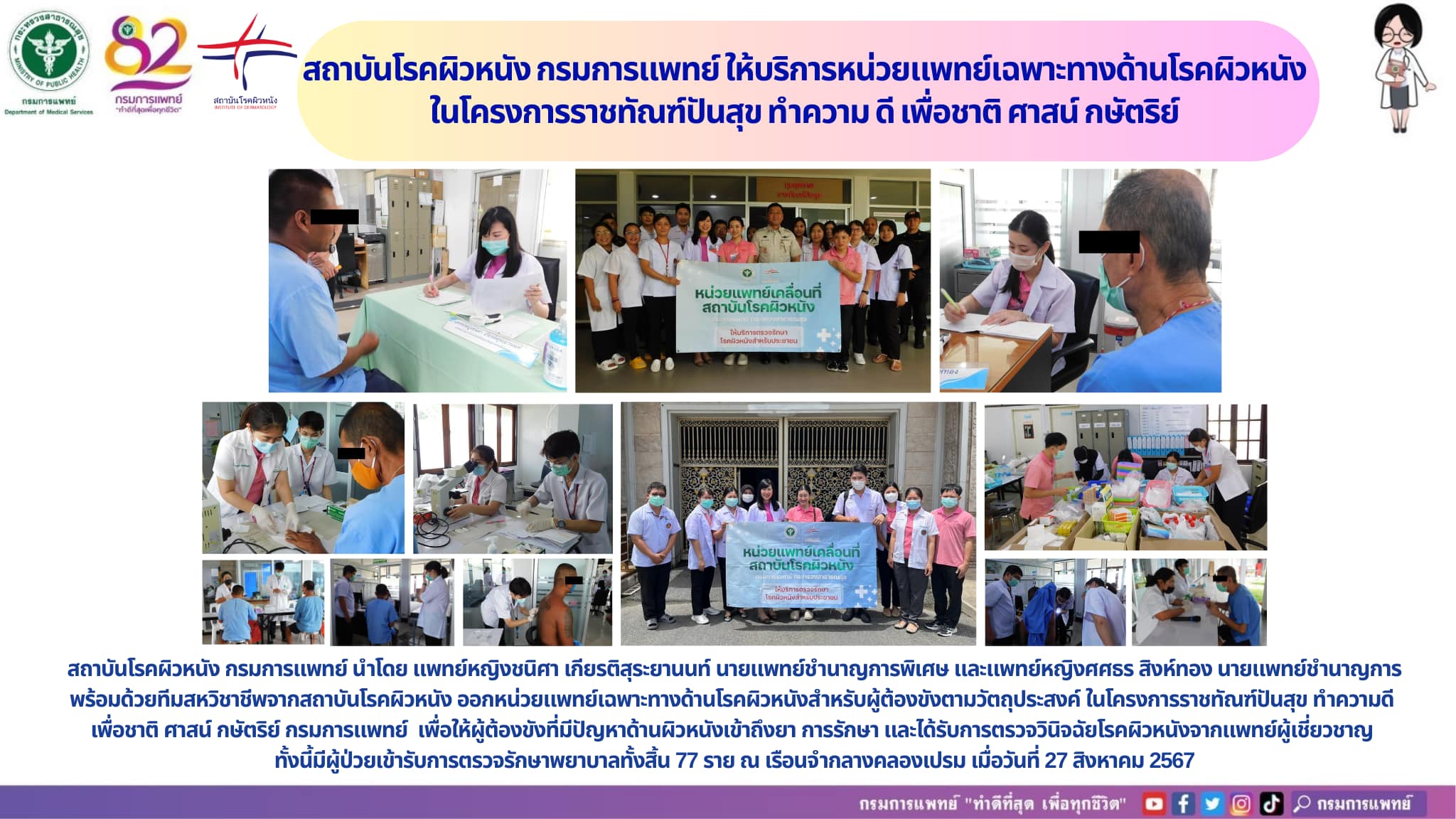 สถาบันโรคผิวหนัง กรมการเเพทย์ นำโดย แพทย์หญิงชนิศา เกียรติสุระยานนท์ นายแพทย์ชำนาญการพิเศษ และแพทย์หญิงศศธร สิงห์ทอง นายแพทย์ชำนาญการพร้อมด้วยทีมสหวิชาชีพจากสถาบันโรคผิวหนัง ออกหน่วยแพทย์เฉพาะทางด้านโรคผิวหนังสำหรับผู้ต้องขังตามวัตถุประสงค์ ในโครงการราชทัณฑ์ปันสุข ทำความดี เพื่อชาติ ศาสน์ กษัตริย์ กรมการแพทย์ เพื่อให้ผู้ต้องขังที่มีปัญหาด้านผิวหนังเข้าถึงยา การรักษา และได้รับการตรวจวินิจฉัยโรคผิวหนังจากแพทย์ผู้เชี่ยวชาญ ทั้งนี้มีผู้ป่วยเข้ารับการตรวจรักษาพยาบาลทั้งสิ้น 77 ราย ณ เรือนจำกลางคลองเปรม เมื่อวันที่ 27 สิงหาคม 2567