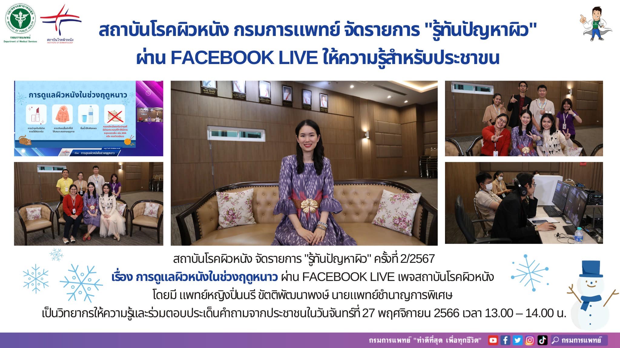 สถาบันโรคผิวหนัง จัดรายการ “รู้ทันปัญหาผิว” ครั้งที่ 2/2567เรื่อง การดูแลผิวหนังในช่วงฤดูหนาว ผ่าน Facebook Live เพจสถาบันโรคผิวหนัง โดยมี แพทย์หญิงปิ่นนรี ขัตติพัฒนาพงษ์ นายแพทย์ชำนาญการพิเศษ เป็นวิทยากรให้ความรู้เเละร่วมตอบประเด็นคำถามจากประชาชนในวันจันทร์ที่ 27 พฤศจิกายน 2566 เวลา 13.00 – 14.00 น.