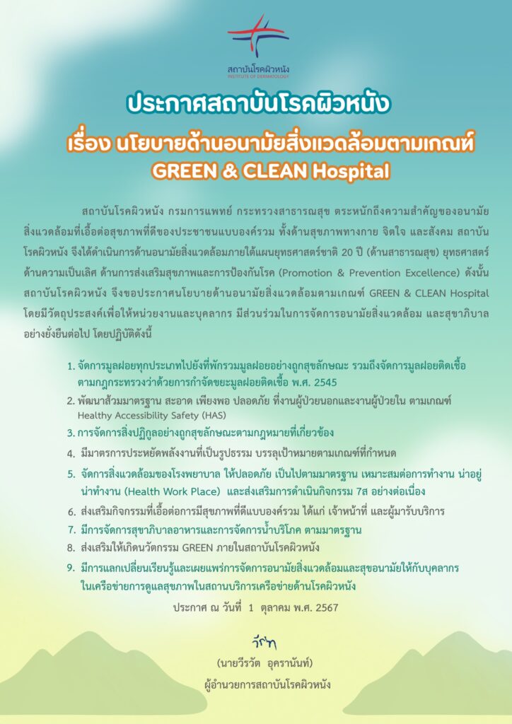 ประกาศสถาบันโรคผิวหนัง เรื่อง นโยบายด้านอนามัยสิ่งแวดล้มตามเกณฑ์ GREEN & CLEAN Hospital